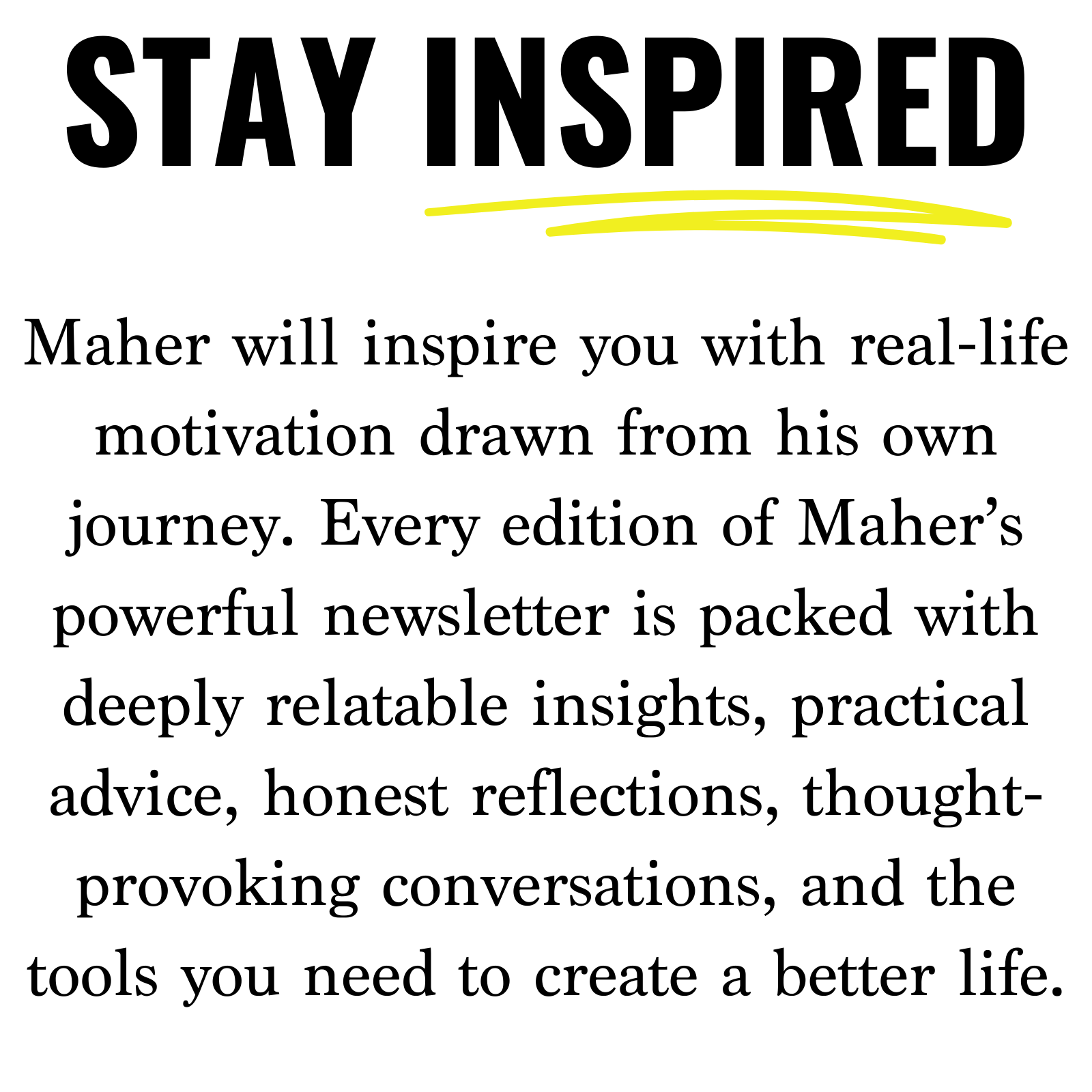 Maher will inspire you with real-life motivation drawn from his own journey. Every edition of Maher’s powerful newsletter is packed with deeply relatable insights, practical advice, honest reflections, thought-provoking conversations, and the tools you need to create a better life.